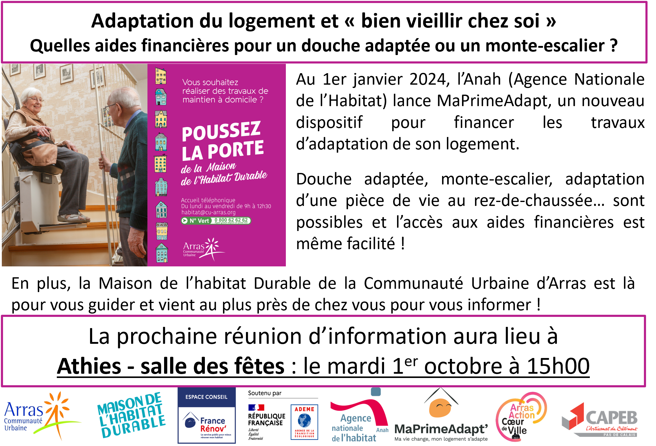 « Tous les Évènements Cet évènement est passé Maison de l’habitat durable: Adaptation du logement “bien vieillir chez soi” 1 octobre 2024 @ 15 h 00 min - 17 h 00 min « Maison de l’habitat durable: Rénovation énergétique – Isolation de son logement: Quels matériaux choisir? Ce week-end, on fête les 4 ans du marché !!! » + Google Agenda+ Exporter vers iCal Détails Date : 1 octobre 2024 Heure : 15 h 00 min - 17 h 00 min Organisateur Municipalité Lieu Salle des fêtes chemin perdu Athies, 62223 + Google Map